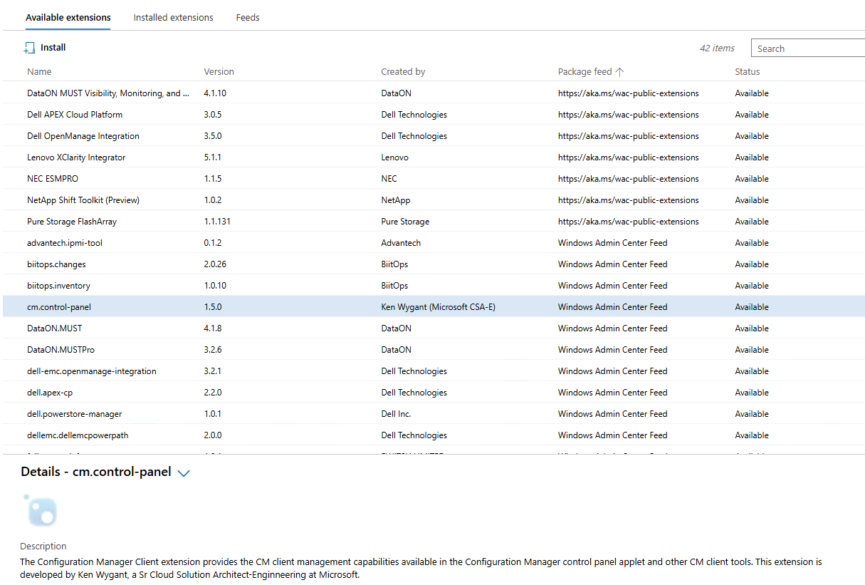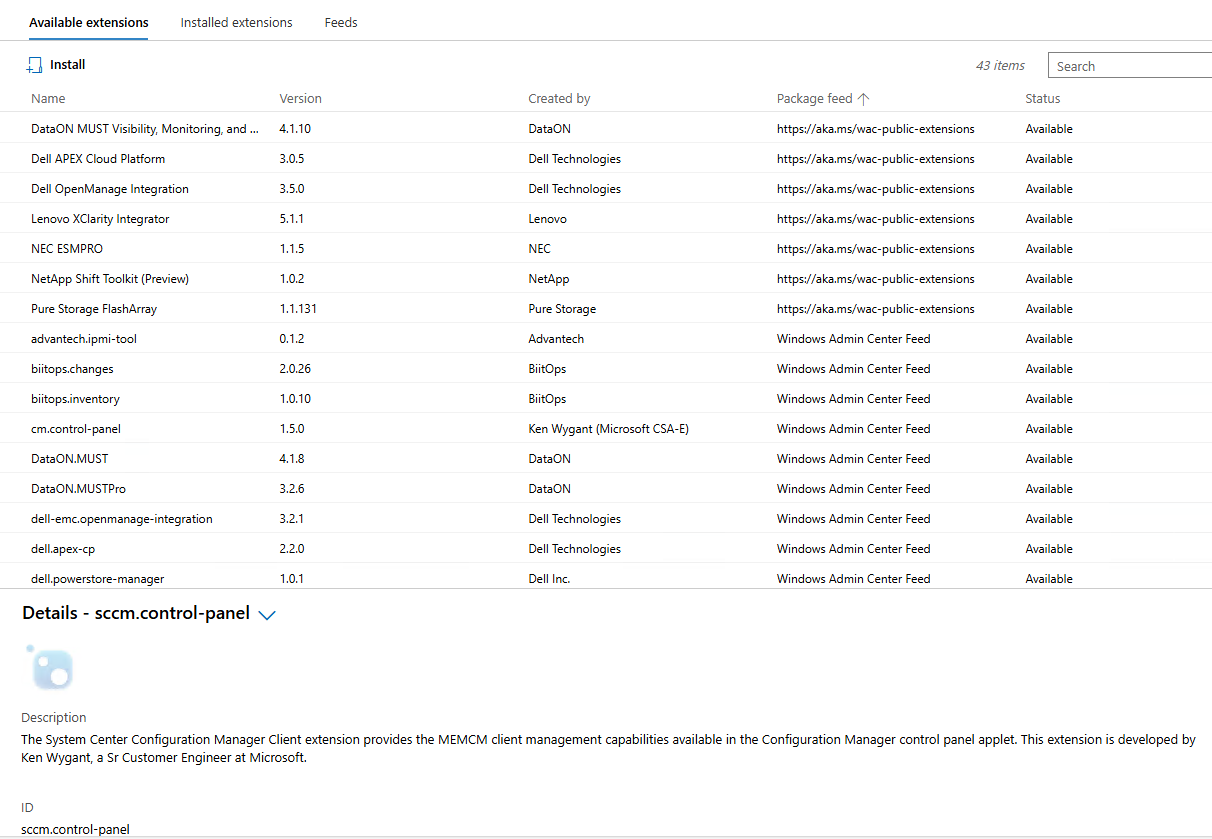 With this older version of WAC we are able to extend WAC functionality with support for Configuration Manager Client and Configuration Manager Client Tools. New WAC (WAC v2) is using different extension feed and as of mid-February 2026 this feed doesn’t have Configuration Manager extension.