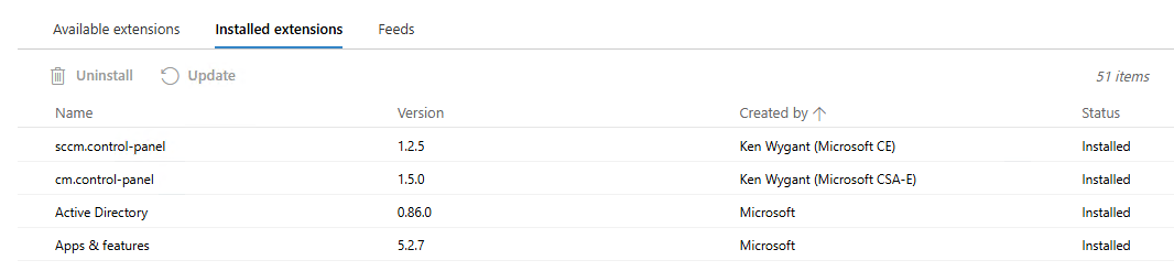 If all goes well, we can now see all “old WAC v1” extensions, including the two for the Configuration Manager Clients: