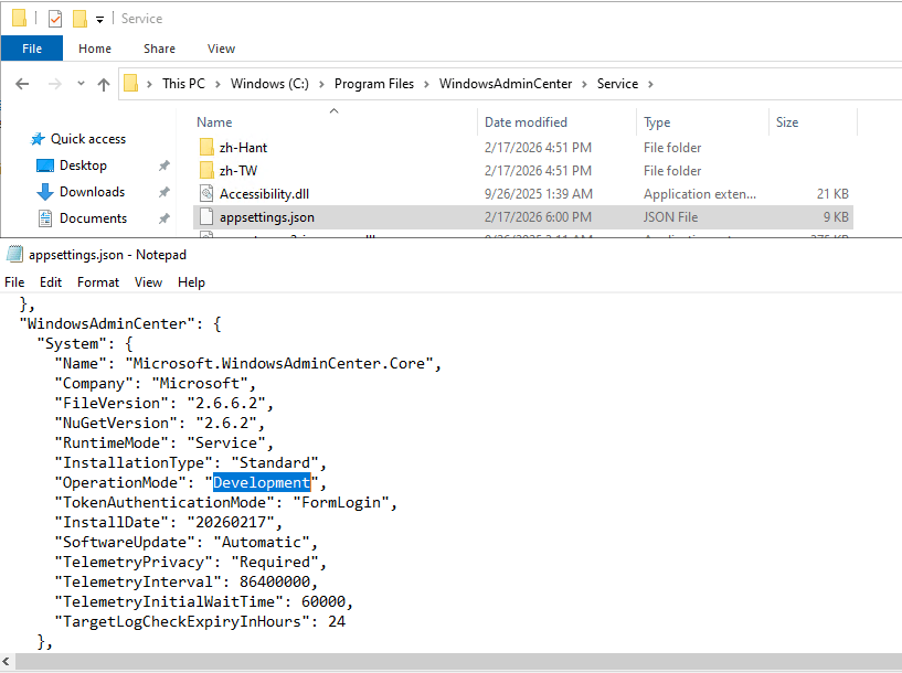 We need to change WAC “operation mode” from “Production” to “Development”. And because this is WAC service configuration file we just changed, we must restart WAC service (Restart-Service -Name WindowsAdminCenter) before we can see this change applied to our WAC portal: