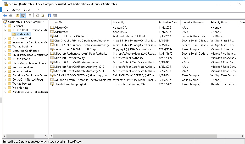 It might happen that you don’t see the “Microsoft Development Root Certificate Authority 2014” certificate in the certificate path (for me this happened on server 2016 DC, that was at the time not connected to the internet):